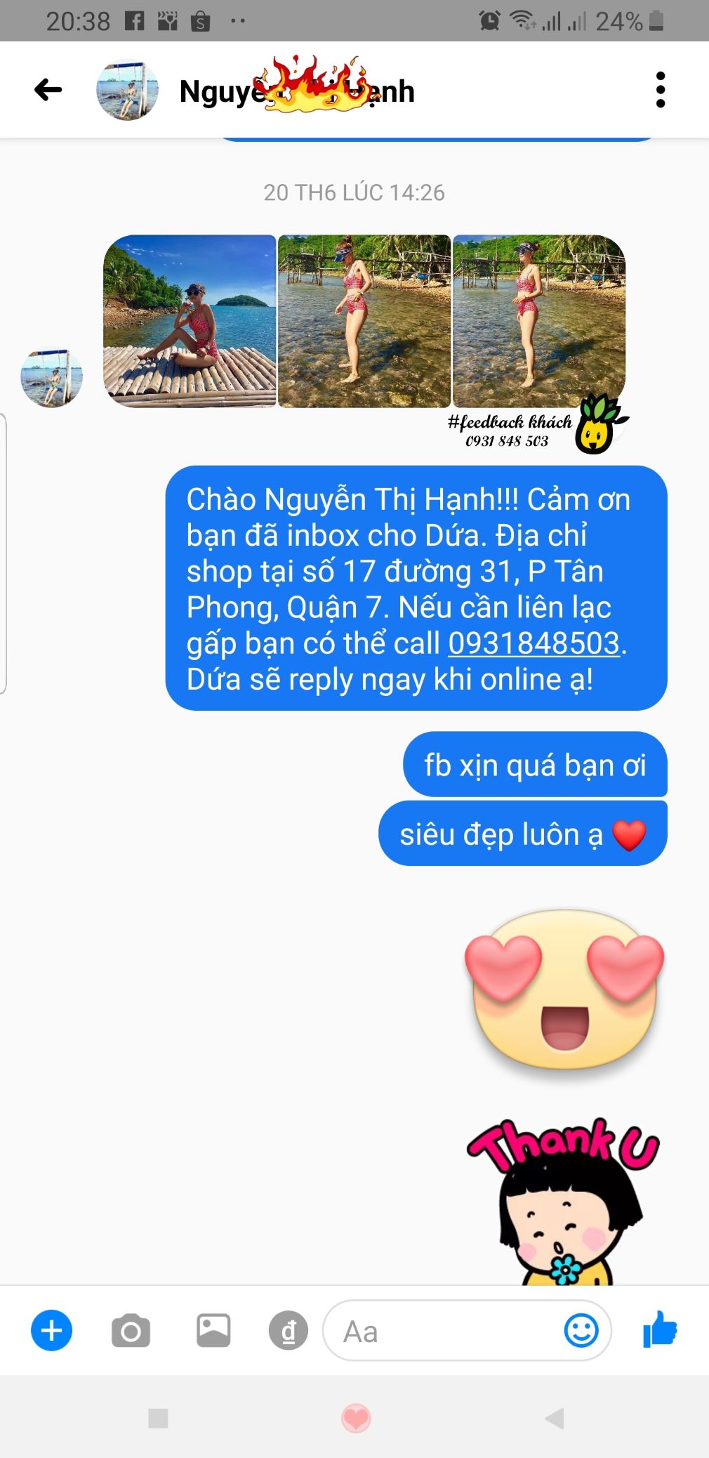 - Cám ơn Chị @Hạnh đã gửi #Feedback đến shop, chúc Chị luôn xinh đẹp và vui vẻ. Hy vọng Dứa sẽ luôn đồng hành cùng bạn trong những chuyến đi du lịch thật dễ thương và ngọt ngào 🤗