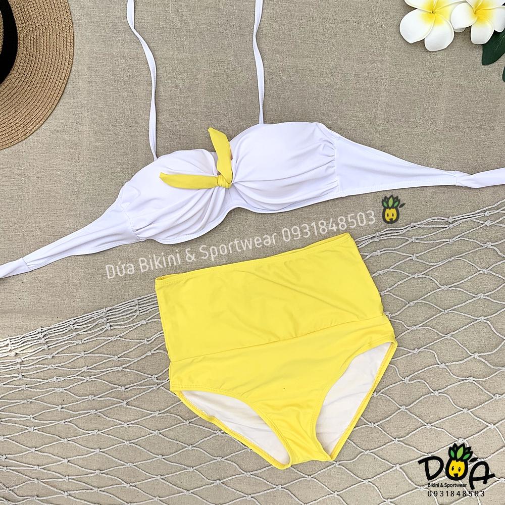Tên sản phẩm : Đồ bơi nữ hai mảnh quần cạp cao vàng phối áo trắng gọng nâng | DỨA BIKINI & SPORTWEAR