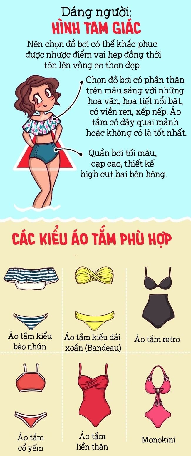 Các kiểu áo tắm phù hợp: Monokini, áo liền thân khoét ngực sâu, áo tắm kiểu dải xoắn (Bandeau), bikini, áo tắm liền thân có chi tiết cách điệu hai bên hông, áo tắm kiểu bèo nhún.