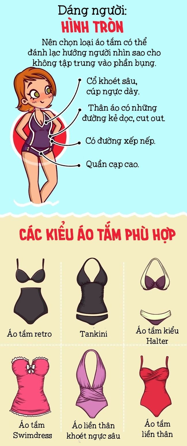 Các kiểu áo tắm phù hợp: áo liền thân, có chi tiết cách điệu hai bên hông, áo liền thân khoét ngực sâu, áo tắm swimdress, takini,bikini, áp tắm kiểu Halter